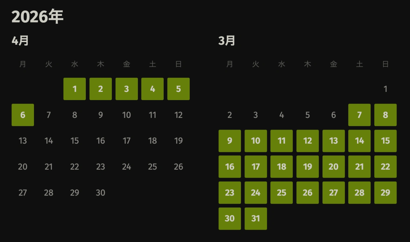 日記セクション(/diary)を単純なリストでなくカレンダー風のデザインにしたのも良かった。スタンプカードみたいに埋めていく楽しさがある。日記を書いた日のマスを緑色にしたのはただの好みなんだけど、図らずもGitHubの“草”っぽくなっていい感じだなと思いながら毎日眺めている。