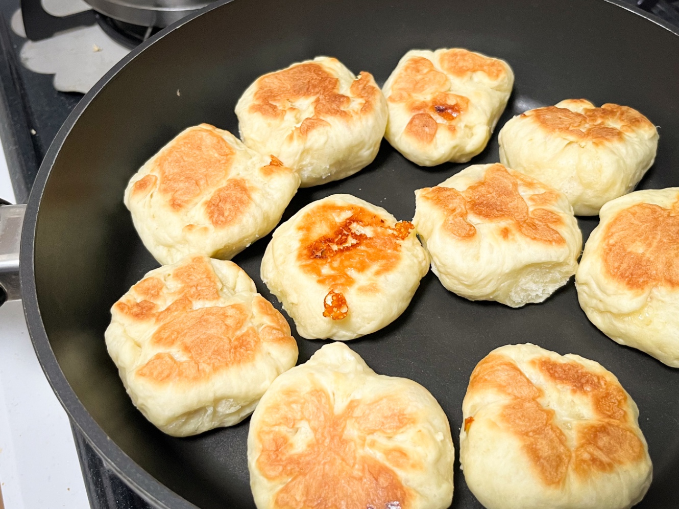 袋の中で混ぜたりこねたりして生地を作るから手がほとんど汚れないし、フライパンで気軽に焼けるのもいい。