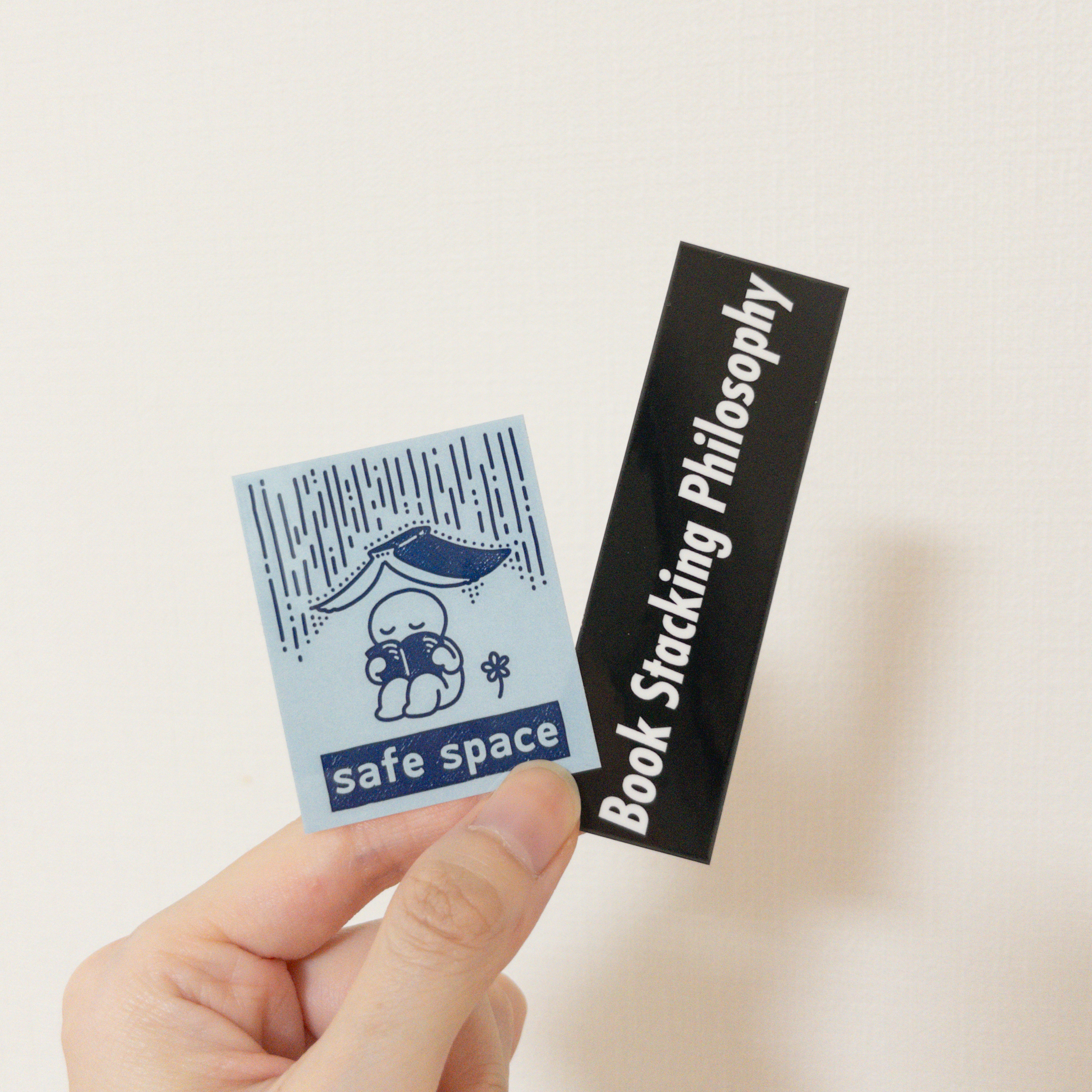 以前からステッカーとかシールとかを作ってみたくて、今回挑戦してみました! 仕事の合間にふと描いたらくがきから、本を読むという行為や本そのものが、読む人にとっての居場所であればいいなあ……みたいなニュアンスです。