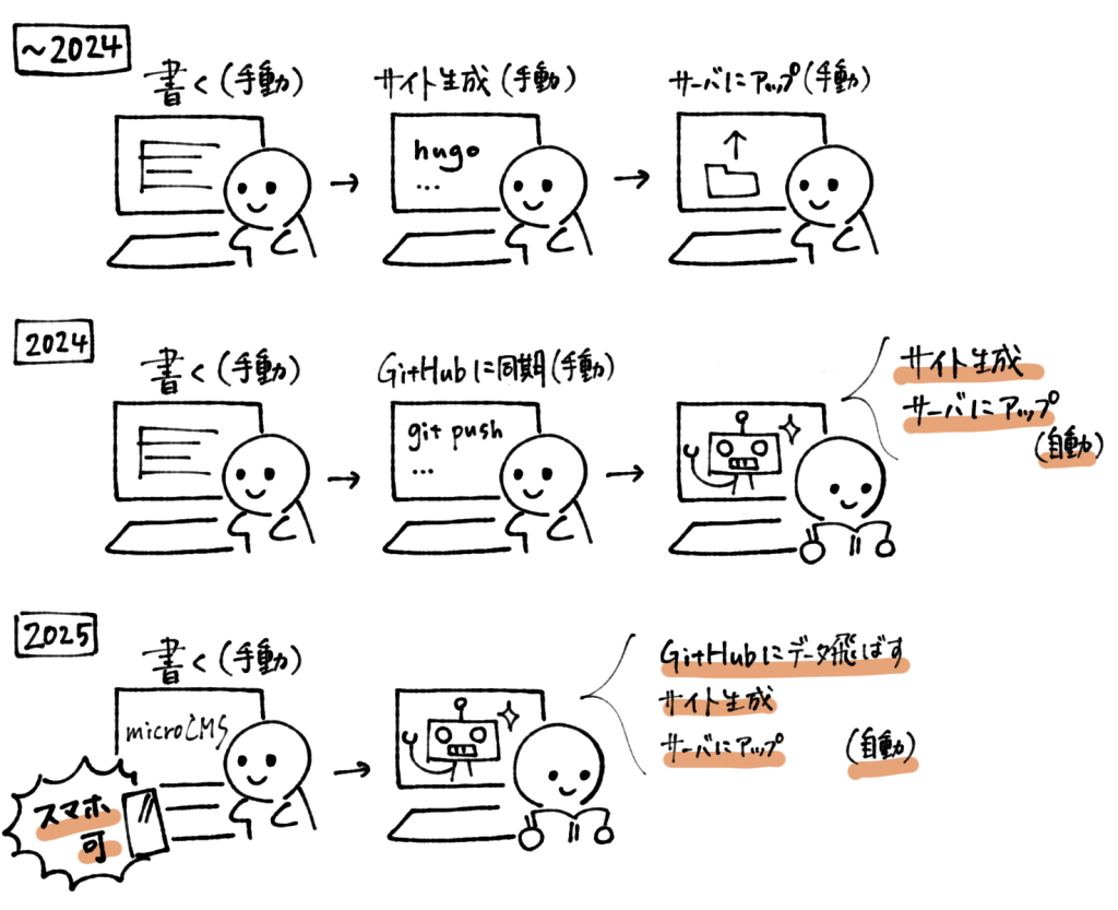 - 2025年(今回):2024年の構成 + Content Adapters(Hugo) + microCMS